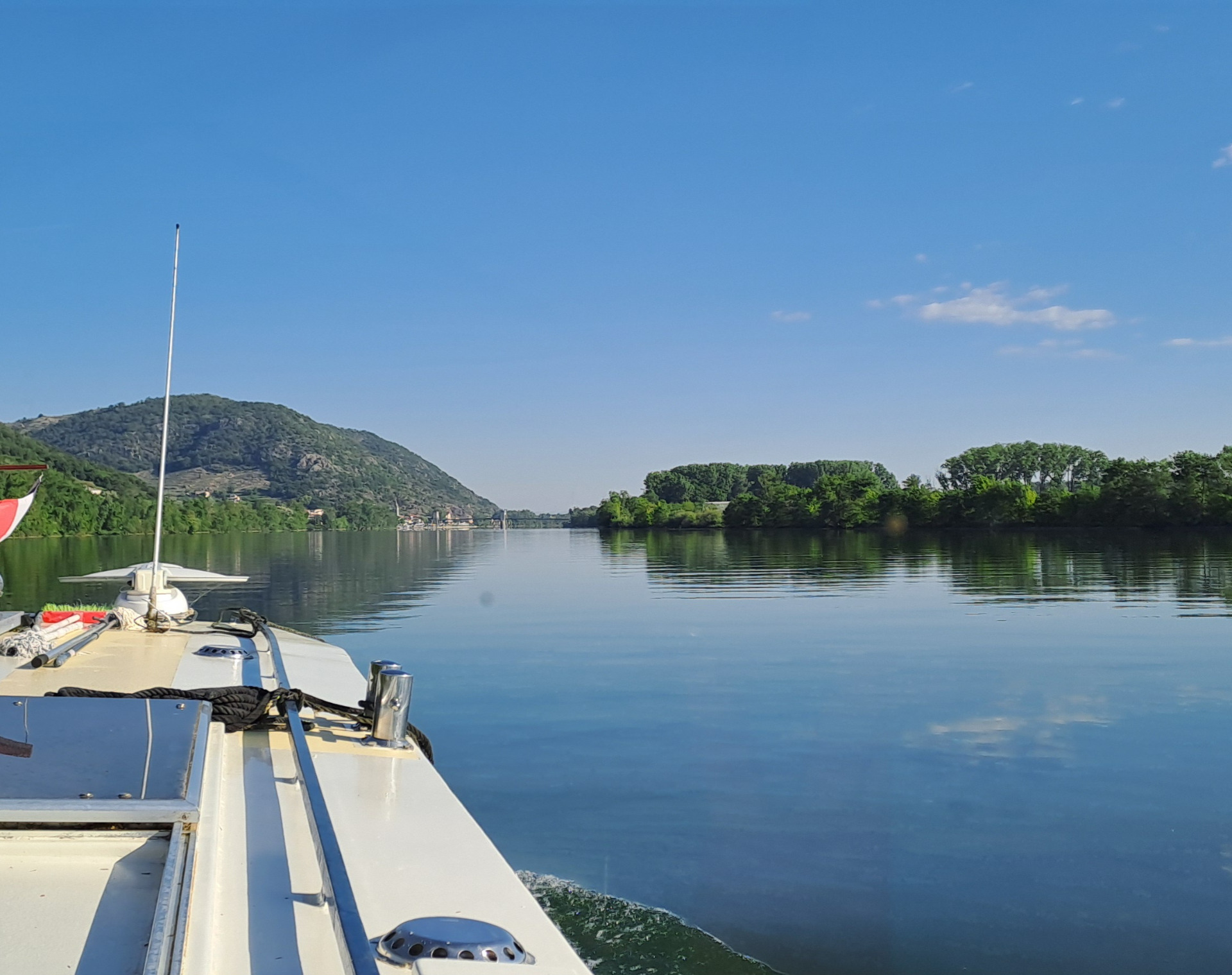 In St. Vallier haben wir eine erstaunlich ruhige Nacht verbracht. Die wenigen grossen Schiffe sind mehr oder weniger wellenlos an uns vorbei gefahren. Da wir eigentlich nur bis zur Schleuse Vaugris wollten, sind wir auch etwas später abgefahren. Die Rhône war weiterhin ziemlich ruhig und so kamen wir ziemlich zügig voran. Bald diskutierten wir, ob wir vielleicht bis nach Lyon fahren könnten, denn dann wäre der Rhône-Stress vorüber. Doch das würde auch bedeuten, dass wir am Abend relativ spät ankommen würden. Wir waren bereits am Nachmittag um 15 Uhr in Vaugris angekommen, die nahe Tankstelle auf der Rhône hatte auch offen und so entschieden wir uns die letzten dreissig Kilometer auch noch zu fahren. Es wurde dann im Kanal bei Ternay doch noch ziemlich streng, denn die liessen plötzlich viel mehr Wasser hinunter. Um 19 Uhr lagen wir jedoch an unserem Platz nach der Schleuse vor den Toren von Lyon, glücklich auch dieses Jahre die Rhône wieder heil überstanden zu haben.